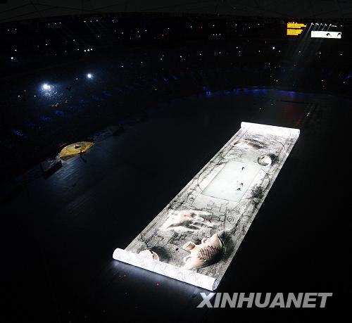一幅真正的中国画卷打开了。它告诉人们,今晚的演出将从一幅中国画卷开始。画卷中央,铺放着一张白纸。造纸术,是中国古代的四大发明之一。