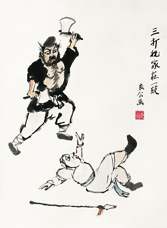 擅长画戏剧人物画的大画家关良,他的艺术具有“笔”简意赅,大智若愚的突出特点,因此他的作品就常常被造假者盯上并被大量赝制出“删减内容”成品。(图1)是我多年前目睹到的关良水浒题材作品,原作画有两个呈打斗动态的人物,该画的笔墨、造型极具生动性与拙趣。可就在见到(图1)不久,在某地一画廊中,我意外地发现了(图1)的“相对克隆”本(图2)。到此疑伪画作上,该画的画面尺寸及内容都大大“瘦身”了,它只画出一个像在空地上耍刀弄斧的李逵形象。对照两图可知,作伪者其实只克隆母本原作一半“画”的内容,款识原母本写的是“三打祝家庄一段 关良画”,到了疑伪成品就只剩下少得不能再少的“关良”两字的穷款。凭心而论,(图2)这件“浓缩”型的疑伪成品,它分明达到七八成的仿真程度,实不多见。我不能不叹服当今书画作伪手法的“高明”,难道这不是书画造假“省时增效”之一招?