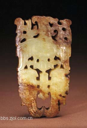 6、玉兽形...高15.4cm,宽10.5cm,厚4.5cm。新石器时代红山文化。 ?i以青黄色玉料制,表面有多处色斑。整体为环形,一侧有一开口,未断开。开口一端为兽首,另一端为兽尾,兽身屈而成环,颈部有二小孔。 目前,多处红山文化遗址中出土了这类器型,它表现的是一种神化了的动物,反映了较大范围的动物崇拜。颈部带有双孔的作品并不多见,此?i可能是制造时所穿之孔位置不理想,作品悬挂时倾斜度不合要求,于是又钻了第二孔。这件作品为清代宫廷遗玉,说明清代宫廷曾收藏红山文化玉器。
