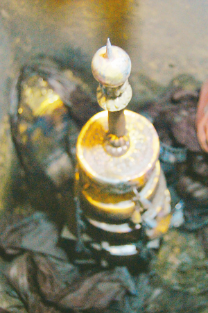 随着昨天下午的考古进程,又有更加精美完整的丝织品展现在大家面前。堆放在保存盒中的深色织物闪耀着金光,上面的织金花纹让人叹为观止,“呀,看得很清楚,上面的纹饰是花叶,”王鲁湘十分兴奋。发掘过程不时有惊喜传来,除了陆续又有大量铜钱出土,紧贴塔刹左侧还发现了垂直放置的一面铜镜,由于铜镜被丝织物与塔刹捆绑在一起,因此考古人员不敢贸然将其取出。为什么在铁函内要放置铜镜呢?王鲁湘奇怪地发问:“难道是照妖镜?”专家表示,肯定有辟邪的因素。随着考古人员不断细心搜寻,又一个葫芦状小瓶出土了。这个小瓶看来十分完好,没有破损,疑似玉质,瓶口还塞有一团丝织物,暂时无法断定是什么材质。此外,一枚指环的出土也引起了大家的关注。一个小瓶中还有一块悬浮在水中黑色的物体,疑为一块沉香木。