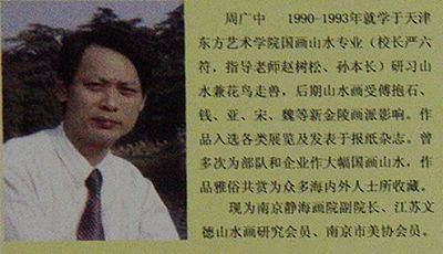 周广中 ,1969年生, 1990-1993年就学于天津东方艺术学院国画山水专业,后受傅抱石,钱,亚,宋,魏等新金陵画派影响。作品传统而有创新,严谨而不失烂漫,绘画,书法,篆刻入选各类展览及发表于报纸杂志。曾多次为部队和企业作大幅国画山水。作品雅俗共赏为众多海内外人士所欣赏收藏。