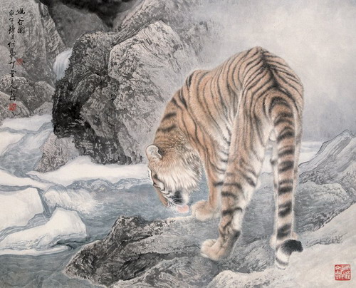 虎是旷古洪荒时代幸存至今的杰作,素以凶猛残暴而著称。千古以来,艺术家们也多是遵循着这种风格来刻画老虎的。汉武帝茂陵的《伏虎》石雕是这样,东晋顾恺之《女史箴图》亦然,到了近代的高剑父、高奇峰兄弟,张大千之兄张善孖以及胡藻斌等人的《虎》图也是这样,然而在大中的笔下,却很难看到“王者之风”、“下山虎”、“归山虎”的威武凶猛,更看不到“风从虎”的恐怖气息,他把虎当作人来画,赋予了威猛强悍的老虎以人格化的柔情细腻,这也正是大中画虎的独到之处。在他的笔下,虎有恋情、有母子柔情、有恋母情节、有思乡之梦、有天伦之乐、有清寂哀伤,他画的虎孤独自傲,威而不露。在艺术表达上,他极尽绘画的精微,并不以剑拔弩张的线条和恣意泼放的墨色取胜,而以尽精刻微的笔法与月色蒙胧般的谐和性表现见长,以至于从不妄下每道笔痕,他把工笔画之功推向了极至,但感觉上却很超逸轻松,令人叹为观止!