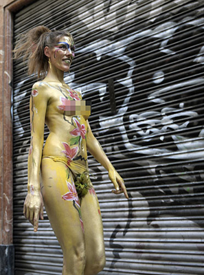 西班牙巴塞罗那市中心7月18日举行了街头人体彩绘表演。赤裸上身漫步并展现人体彩绘的女子,引来众人目光。