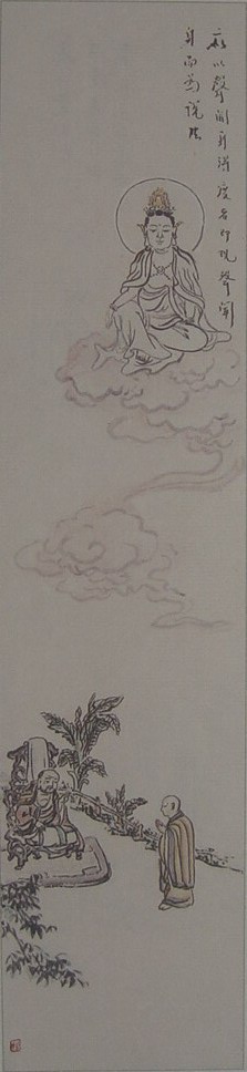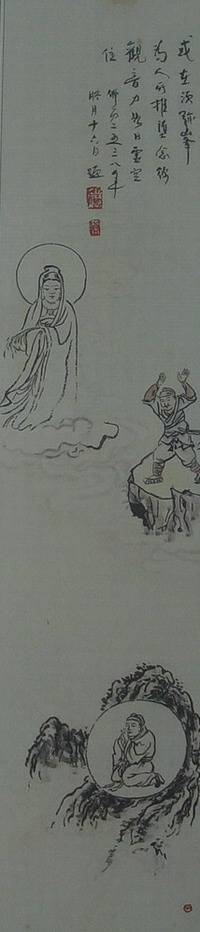 圆霖大师善画观音、西方三圣等佛教人物画。早年工笔,一丝不苟;晚年写意,简约恣意,三笔两笔,形同书写,而人物神情毕现,可见书画同源之精神。笔者曾观赏圆霖大师所绘13幅《观世音菩萨救苦救难图》,此图实则为观音大士救济人间苦厄之13个故事,所以幅幅画面不同。笔者所见《观世音菩萨三十二应身》之19幅应身图,亦图图有别。圆霖大师曾应苏州灵岩寺方丈明学法师之邀,图绘工笔重彩人物画之莲宗十三祖师像,瞻仰之中,但见张张传形、页页传神。同出大师之手的16尊简笔写意人物画,则风格迥异,惟见墨线勾勒,赭色淡着,素雅平淡之中益增佛界气氛之庄严。