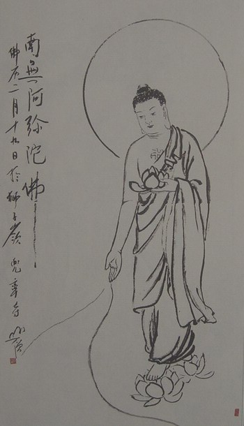 圆霖大师善画观音、西方三圣等佛教人物画。早年工笔,一丝不苟;晚年写意,简约恣意,三笔两笔,形同书写,而人物神情毕现,可见书画同源之精神。笔者曾观赏圆霖大师所绘13幅《观世音菩萨救苦救难图》,此图实则为观音大士救济人间苦厄之13个故事,所以幅幅画面不同。笔者所见《观世音菩萨三十二应身》之19幅应身图,亦图图有别。圆霖大师曾应苏州灵岩寺方丈明学法师之邀,图绘工笔重彩人物画之莲宗十三祖师像,瞻仰之中,但见张张传形、页页传神。同出大师之手的16尊简笔写意人物画,则风格迥异,惟见墨线勾勒,赭色淡着,素雅平淡之中益增佛界气氛之庄严。