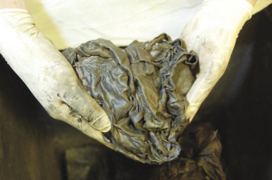前天的发掘进程已经把大家的注意力完全“胶着”在了一座鎏金七宝塔上,焦急的人们恨不得能火眼金睛立马穿透塔外的丝织物,一看究竟。可是著名文化学者王鲁湘却对一团黑乎乎的包裹开始了浮想联翩:“塔高近一米,包裹塔身的应该是一块巨大的丝织物,会不会是一件袈裟?这个大家都有印象,唐僧去西天取经,那件宝物可是引起了众多妖怪惦记的……”