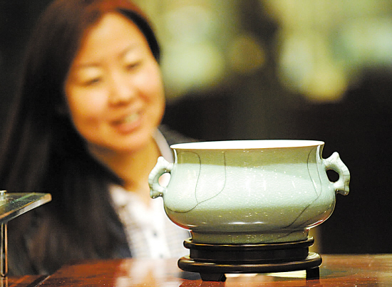 在北京合璧兴陶瓷艺术馆观看哥窑鱼子纹青瓷珍品“鱼子炉
