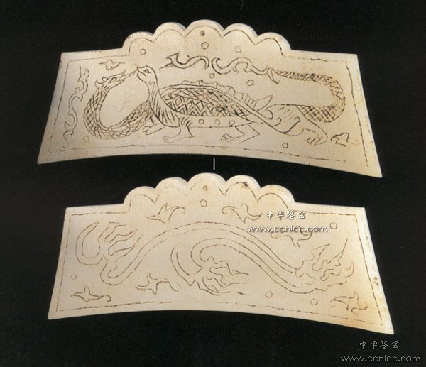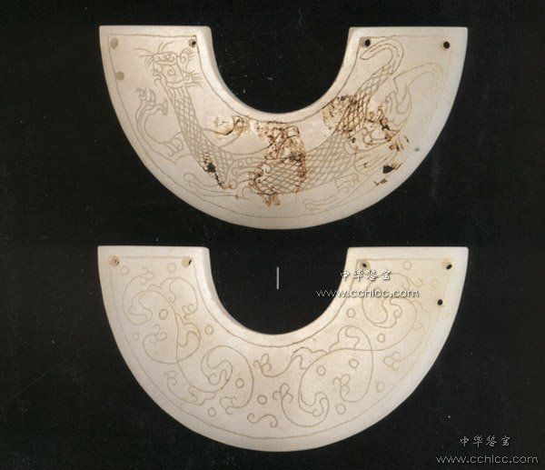 。 39、玉璜 六朝.jpg (67.16 KB) 2010-4-2 20:54 。 39、玉璜 六朝 外径7.2,内径2.8,宽2.2,厚0.3厘米 安徽省当涂县青山六朝墓出土,现藏于安徽省文物考古研究所 白玉微透明,玉质温润。半圆环形扁平体,线刻外廓,内阴刻一张牙舞爪的瘦长体青龙,龙尾上卷,背面阴刻缠枝纹,璜上端两边各有一个和二个圆孔,磨制精致,线条流畅。