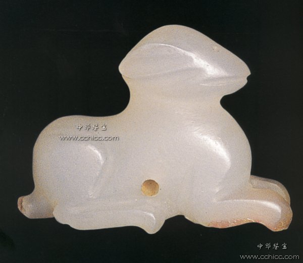 。 46、隋代 兽形玉佩.jpg (45.02 KB) 2010-4-2 20:54 。 46、隋代 兽形玉佩 长2.7、高2厘米 陕西省西安市玉祥门外隋李静训墓出土,现藏于中国国家博物馆 玉色青白,圆雕,兽形,形似兔,尖吻,大耳,短尾,四足伏地,在前后足之间,由左侧斜穿一孔,底部琢出凹槽,除底部外,通体抛磨光亮。