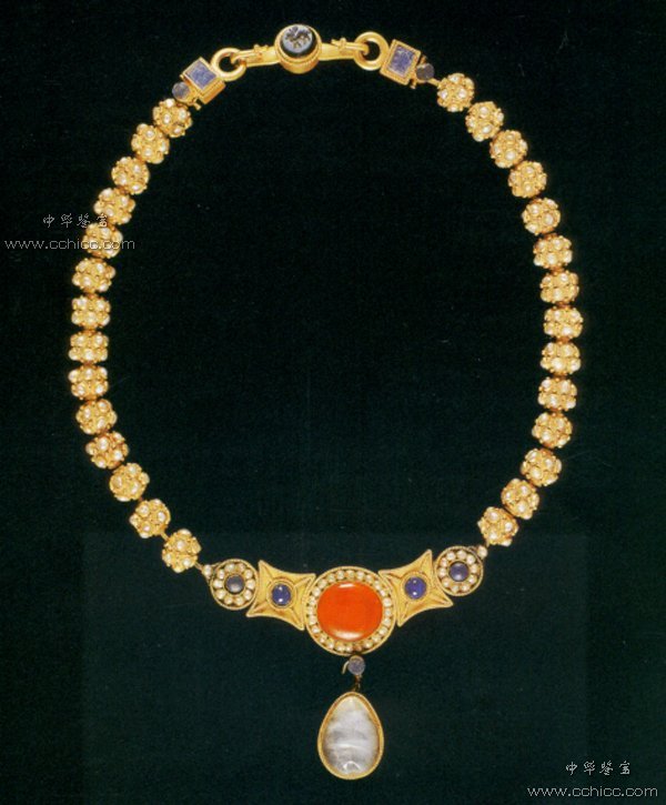 。 47、隋代 玉钗.jpg (52.74 KB) 2010-4-2 20:54 。 47、隋代 玉钗 左:长8.1、上宽1.8、下宽1.2、钗径0.4厘米 中、右:长6.8、上宽1.5、下宽1、钗径0.4厘米 陕西省西安市玉祥门隋李静训墓出土,现藏于中国国家博物馆 玉色洁白。三件玉钗形制相同,均为双股钗,上端内直外弧,股扁圆,由上至下渐细,前端近锥形,通体抛光,工艺精湛。 。 48、隋代 镶宝珠金项链.jpg (83.12 KB) 2010-4-2 20:54 。 48、隋代 镶宝珠金项链 周径43、垂珠长3.1厘米 重91.25克 陕西省西安市玉祥门隋大业四年李静训墓出土,现藏于中国国家博物馆 项链由各镶10颗珍珠的28个球形饰所组成,金球分为左右两组,每组14个,各球之间用金丝编织的链索连接,在两组金球链索之顶端各有一方形金饰,内嵌“青金石”。项链下端有五件垂饰,居中为圆形金饰,其内嵌有红色鸡血石,鸡血石一周有24颗珍珠,左右两边各连接一四边内曲的方形金饰,其上皆嵌有蓝色珠饰,最下端挂一心形蓝色珠饰,其边缘的金饰作三角并行线凹入状。