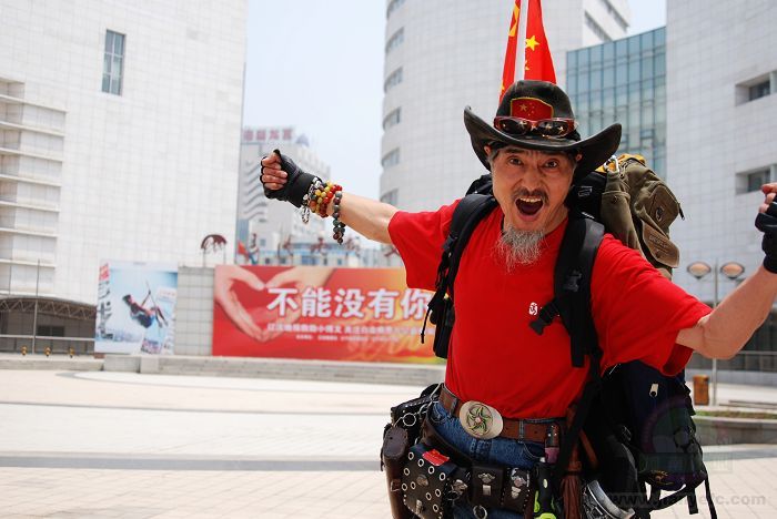 在北京见到罗西时,并没有看到他那个沉重而又巨大的背包,但基本的装束还在:标志性的西部牛仔帽、腰上琳琅满目的饰品、玩具左轮手枪、匕首、手机、步话机、喇叭,幸好他具有一个为人熟知的球迷属性,否则以他怪异的装扮很可能不被允许上火车。在我眼里,他并不算名人,但他自我感觉良好,打电话时会职业地报上大名,“嗨,你好,我罗西!”