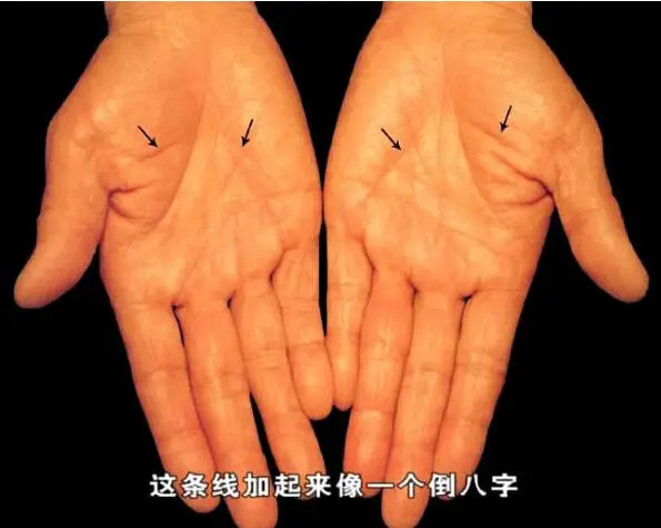 如果出现下图的倒八字四线,就要注意拉,必须戒酒,这个预示肝脏出问题了,很容易有肝硬化,消化道出血等问题发生了。