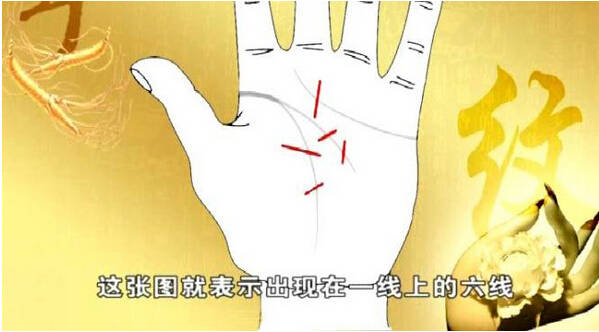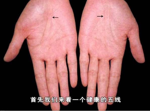五线。明显的五线应该是从腕横纹升起,一直向中指下走的直直的一条线。古代称为玉柱线,认为是做官的一条线。王晨霞认为玉柱线与呼吸系统的肺活量有关,玉柱线越明显,其实表示你的缺氧情况越严重。普遍的白领都有很多明显的玉柱线,因为平时都坐着,出入坐车,运动量很少,造成缺氧。如果出现明显的五线,就要经常做扩胸运动,去山里爬山锻炼的,到树底的水边深呼吸含负离子丰富的空气。后汉书中说西王母非常的长寿,而西王母为什么长寿呢,因为她善啸,什么是啸呢,就是深呼吸,一呼一吸时间都很长。就如运动员,他的五线就很少会出现。