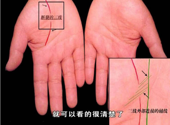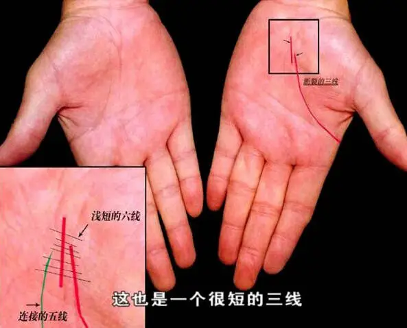 但是毕竟断裂的三线是有问题的,意味着身体的健康状况出了问题,想要通过医生和自己平时的生活饮食进行调理,让白线重新把断裂的部分进行连接和修补。若一个人的三线很短很浅,这个意味着这个人的身体出现一个很重大的疾病问题了。三线的形成其实跟胎儿在发育时期就有关系了。因为胎儿在发育的时候,都是握拳状的,这个三线就是压痕。如果胎儿没有握拳,这意味着宫内缺氧,手就松下来了。于是出生以后三线就变浅短。