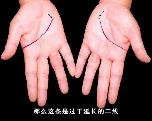 二线不能太长,不能超过无名指端的二分之一处。若过长,对于男性来说,容易神经衰弱,伴有性功能下降,也就是中医说的肾虚。女性往往是内分泌紊乱,更年期的一种,会导致精神障碍,唠唠叨叨,烦躁不安,或者严重的失眠。这往往是一种优柔寡断的线,但不是抑郁症。如果这线非常靠近三线,那就有可能是抑郁的线。