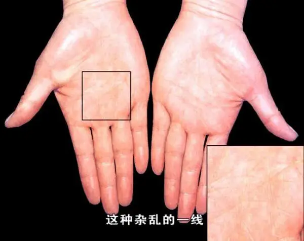 二线成为脑线和智慧线,主要反映人的心理活动,思维活动,同时反映了我们的心脏和消化功能,中医认为心藏神,心主思维。若二线发生病变,如下,是一条平直的二线,而还有断裂,非常典型的头痛病人的二线,反映的问题是有头疼症状,不但现在头疼,老了还会脑萎缩。