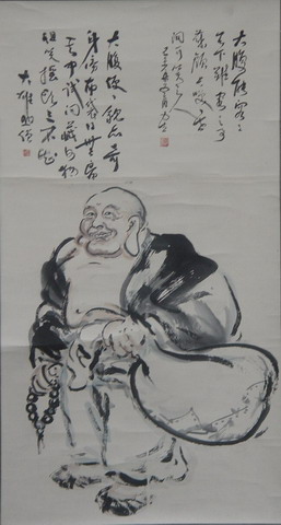 圆霖法师身处佛门,以艺术宣扬佛家至理,但并不是简单地将佛门奥义移植到艺术之中,而是结合自身的人生经历,把参佛苦修得来的对生活的认知,个人的存在价值,社会的真谛作为艺术符号幻化在自己的笔墨之中。如《寒山拾得问答图》(图三)[11]是圆霖法师禅意较重的精品之作。图中的寒山与拾得,相对一站一坐,以粗线条概括形象,简练无比,但一问一答之画意则表露无遗。显然,圆霖借寒山与拾得的问答,告诉世人与人相处的道理:对于别人的挑衅与欺凌,不需与他针锋相对,不理不会,且看他如何造化。由此可见圆霖法师的画,画并不是画,而是禅理;画的不尽是画,还有机锋。