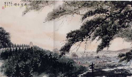 傅抱石为了创作的这幅作品,他画了很多遍《雨花台颂》,为了画好纪念碑,他特意让学生去现场画来速写研究,为了体现“颂”这个主题,他省略了雨花台附近一些不适合入画的实景,特意用红色在前面画了一些花上去……