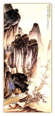 张大千30岁以前的画风可谓“清新俊逸”,50岁进于“瑰丽雄奇”,60岁以后达“苍深渊穆”之境,80岁后气质淳化,笔简墨淡,其独创泼墨山水,奇伟瑰丽,与天地融合。增强了意境的感染力和画幅的整体效果。 |