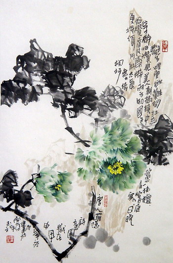画牡丹是中国的传统体裁,牡丹是象征着宝贵、象征着繁荣,是老百姓喜闻乐见的体裁,许多画家都在画牡丹,画牡丹对画家委不容易,有两句诗:“早知不入时人眼,多买胭脂画牡丹。”这说明了牡丹是雅俗共赏的东西,是老百姓喜闻乐见的东西,但是画牡丹不能太俗,我看了罗玉祥画的牡丹鲜艳,但她不俗,不俗就是在他的用笔墨上非常好,他的浓浓淡淡的画的牡丹叶、枝杆都画得很地道,画得都很熟练,我认为他的牡丹很有特色的而且特别是在南京,二十几年前我也曾经讲过:“独秀江南”,目前看了他的画突飞猛进,所以在画坛上纷纷饶饶的这么多画家,他确实是“一枝独秀”。