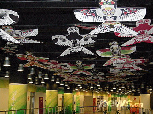在北京奥运会主新闻中心内拍摄的具有中国特色的风筝造型的屋顶。随着北京奥运会临近,主新闻中心各项工作井然有序地展开