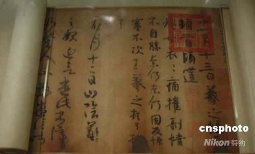 位于北京国家奥林匹克公园中心区的中国科技馆新馆七月二十八日开始举行“奇迹天工——中国古代科技与文明”展览。展览荟萃了二百七十一件(组)文物珍品,其中一半以上都是国家一级文物。图为纸质文物中的晋代大书法家王羲之书法《姨母贴》,共六行四十二字,书体以行楷为主,皆有隶书,是其早期作品。