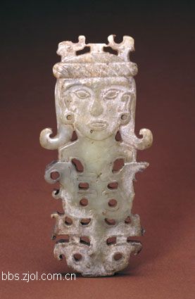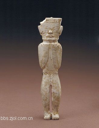 1、玉立人 ...高9.6cm,肩宽2.3cm,厚0.8cm。新石器时代含山文化。 玉料因受沁呈鸡骨白色。玉人作立状,方头,以阴线方格纹刻划出冠,大眼,三角形鼻,大嘴,唇上有须,两耳垂处各有一圆形钻孔。双臂贴胸而抱,十指分开,腕部有阴刻衣纹。束腰上雕出斜纹带饰。双腿间有缝隙,雕出脚趾。 此玉人比例匀称,雕刻刀法简练,展示出古人部分服饰的简貌,也反映了江淮地区史前时期匠人们的雕刻技能,为迄今所见新石器时代最完整的直立玉人。有人称此时期为含山文化时期。含山文化,1987年发现于安徽省含山县凌家滩,位于长江中下游地区,它晚于同一地域的河姆渡文化和马家浜文化,而应早于良渚文化,与同一地区的薛家岗文化相当,是中国早期玉文化发展的重要地区之一。