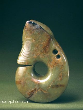 6、玉兽形...高15.4cm,宽10.5cm,厚4.5cm。新石器时代红山文化。 ?i以青黄色玉料制,表面有多处色斑。整体为环形,一侧有一开口,未断开。开口一端为兽首,另一端为兽尾,兽身屈而成环,颈部有二小孔。 目前,多处红山文化遗址中出土了这类器型,它表现的是一种神化了的动物,反映了较大范围的动物崇拜。颈部带有双孔的作品并不多见,此?i可能是制造时所穿之孔位置不理想,作品悬挂时倾斜度不合要求,于是又钻了第二孔。这件作品为清代宫廷遗玉,说明清代宫廷曾收藏红山文化玉器。