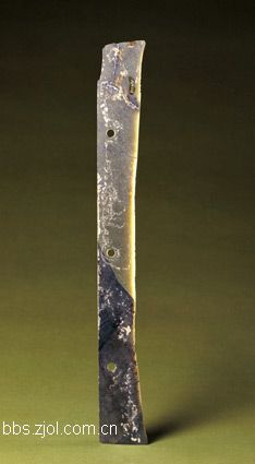 9、三孔玉刀...长49.1cm,宽5.9cm,厚约0.1cm。新石器时代龙山文化。 刀玉料呈墨绿色,长方形薄片状,背平直,刃部内凹,一端为方形,另一端略窄。玉刀的一面光滑细亮,另一面较粗糙。此类玉刀在陕西龙山文化遗址中已有发现,陕西省神木县石峁遗址出土的这类玉刀所用玉材及加工方式同这件作品非常相似,玉刀具有开片薄、刃部锋利、钻孔标准等特点。 这件玉刀的平均厚度约0.1cm,表现出非常好的开片技术,刀背部三孔非常规范,无明显的孔径变化,刃部的锋利达到了可以割切的程度,具备了实用的可能性。