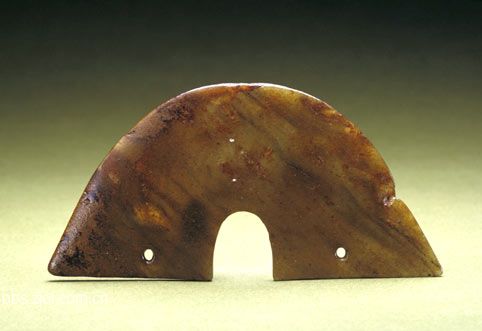 19、玉璜...高5.2cm,长10.6cm,厚0.3cm。新石器时代崧泽文化。 璜玉料材质较好,黄褐色,较薄。近似半圆形,直弦,中部下凹,两侧各有一孔,底部两角略向外伸。璜的一面有弧形凹槽,是对玉料开片时留下的切割痕,这类切割痕在新石器时代玉器上时有出现,从痕迹上可以看出,玉器加工中采用的是线切割的剖料方法。玉片厚度约0.3cm,表明当时玉料开片技术已达到一定的水平。作品呈不规则的半圆形,两角外伸,说明此璜并非由圆形玉器切割而成,可能是以长方形或三角形玉片磨成。