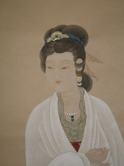 《散花飞天》一幅作品,从造型到色彩,在很大适度上借鉴和吸收了敦煌壁画的表现方法,又融和了工笔画的勾染技法,画面上祥云缭绕,飞天挥洒的瓣瓣花雨随彩带飞舞,飘落人间,表现了一种富丽飘逸,艳而不俗的绘画风格。有诗曰:仙乡隐隐起云霞,歌罢祥和瑞气发;彩带飘飘飞碧落,人间遍植幸福花。《八十七神仙卷》为吴道子传世作品中之神品,被徐悲鸿先生视为“悲鸿生命”,又因失而复得,富有传奇色彩。画面上有八十七位神仙因此得名,人物众多,神态各异,线条刚柔相济而变化万千,临摹起来难度相当大,工作量亦很繁重,从早到晚,废寝忘食,也要几个月方能完成,辛苦异常。在当今物欲横流的大环境下,要守得住清贫,耐得住寂寞,杜门谢客,潜心作画,方能画出这些雍容大度、仙风道骨、灵动飘逸的一系列的作品来。
