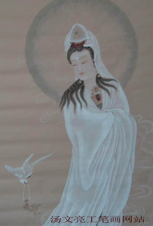汤文亮,江苏徐州人,自幼酷受绘画,现被聘为欧洲国际东方美术研究院特别理事,中国香港亚洲美术家协会会员,江苏省国画院特聘画家,江苏省美术家协会会员,画风师法晋唐宋元,工写兼长,尤擅绘仙佛人物、花鸟、草虫等题材。观汤文亮工笔画之作品,如《西山放鹤图》、《乘龙观音》、《乘鲤观音》、《伏虎观音》、《送子观音》、《散花飞天》、《八十七神仙卷》等等,或大气磅礴,或工整细腻,令观者于肃穆俯仰间浮想联翩。