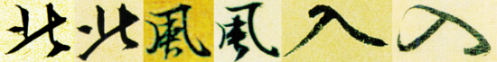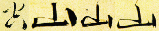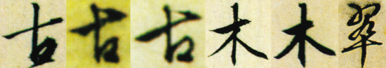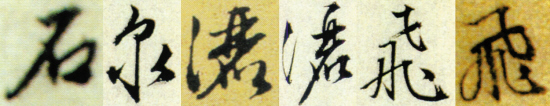 “北風入”这三个字写得极为生硬和呆滞,起笔、行笔、转折无不显示出作伪者笔下功夫的欠缺和对文徵明笔触习性(图2)的懵然无知;“空山”二字,其“空”字用草书写法与上下字比较显得唐突,有夹生之感,且其草法的笔画也写得僵死乏趣,“山”字的形态呆若木鸡,了无文徵明那种爽辣、跌宕的起伏韵律(图3);“古木翠”三个字,笔画僵硬,其中尤以“翠”字最为拙劣,笔触、结体与文徵明迥然有异(图4);“何處”二字,用笔软弱、结体乏俗,“瑯玕”二字字形笨拙、笔画板结,二字之间缺乏连贯的意态,衡之图5,其劣显见;“石泉灑飛雨”五字,其病与“瑯玕”二字无异,盖因用笔无方、笔力全亏,其中尤以“灑飛”二字最为拙劣,比之图6、7,其伪毕现;余下的如“月、乘、過、王、齋、茶、草圖”以及“祿之”、“徵明”诸字,可能无须逐一点评,只需大致比照一下文徵明的真迹字样,真假美猴王自是一眼可以看穿的。