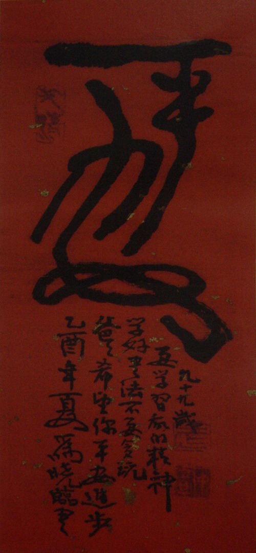 我注意到武老写赠给她的一幅有趣的书法,红色洒金纸上两个似篆似草的“平安”大字,下署行书款曰:“乙酉年夏为武临书。爸爸希望你平安进步,学好书法,不要贪玩,要学习我的精神。九十九岁。”慈父的拳拳爱女之情跃然纸上。要知道,这时的晓临已经是年届花甲了,在父亲的眼中,女儿还是当年把手相教的孩子。这是我在武老雄强书风之中见到的脉脉温情。