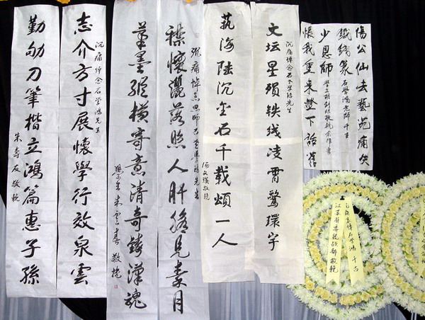 江苏省委统战部、江苏省政府办公厅、中共江苏省委台办、江苏省书法家协会、江苏省文史研究会、民革江苏省委员会、江苏省台属联谊会、中国标准草书学社、南京云锦研究所、南京静海画院等单位,文化艺术界尉天泄、言恭达、米云春、俞律、萧平、徐自学、苏金海、徐利明、胡剑明、胡学义、候国新、吴欣宇、王宝林、常国武、张雪融、张玉英、成懋冉、赵立军等送了花圈花蓝。