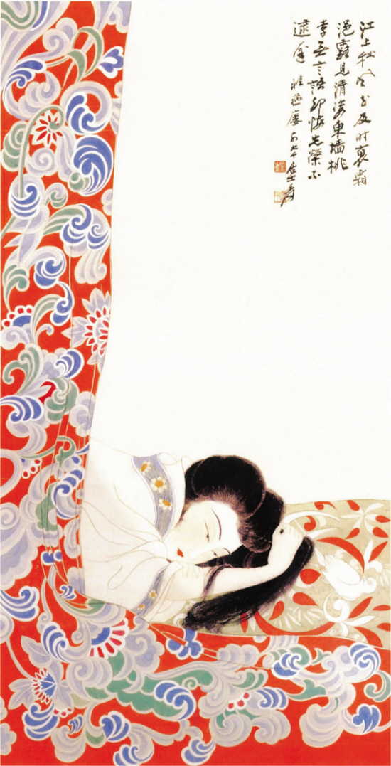 首先,图1的画题定位《敦煌仕女图》是有悖画作的立意的,她不是敦煌仕女,而是描绘画家心目中一位沉浸于情怨且懒于梳妆的思春少女。这一且情且怨“长眉懒画尚惺忪”的人物神态在图2、3中刻画得是极其成功的,看那少女微微睁开的惺忪睡眼,真可谓欲睡亦难,欲醒亦难。而图1则不然,其眼神显得十分痴呆,无情亦无怨。