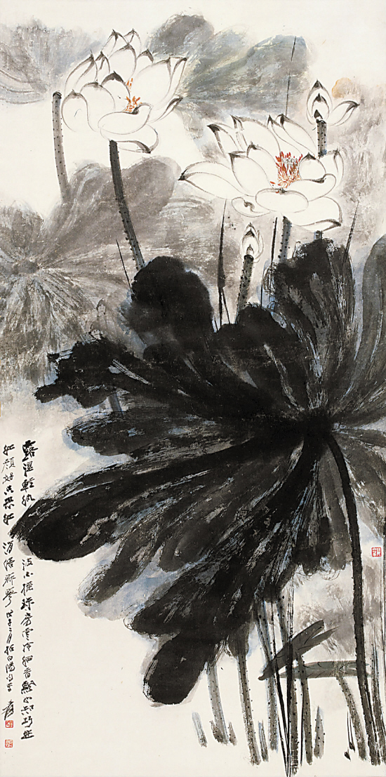 《白荷》(图4)立轴 设色纸本 纪年戊子二月(1948年) 尺寸:133×66cm 估价:120万—180万元。款识:“露湿轻纨波不摇,珠房云冷细香飘。也知巧作红妆好,只恐红消更寂廖。戊子二月拈白阳句写,爰。”钤印:“张爰”、“大千大利”。