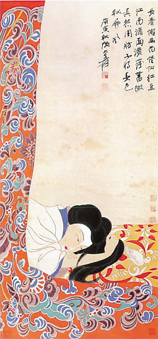 图1有其姊妹本,如图2《情殇图》、图3《春睏图》(130×61cm,纸本设色 镜片,纪年1950年,款识:“长眉懒画尚惺忪,红豆江南酒面浓。薄旧微嗔怨周肪,不将春色秘屏风。庚寅秋张大千爰。”钤印:“西川张爰”、“大千”。)然,通过仔细比照,我们会发现图1的笔墨有值得再研究的必要。