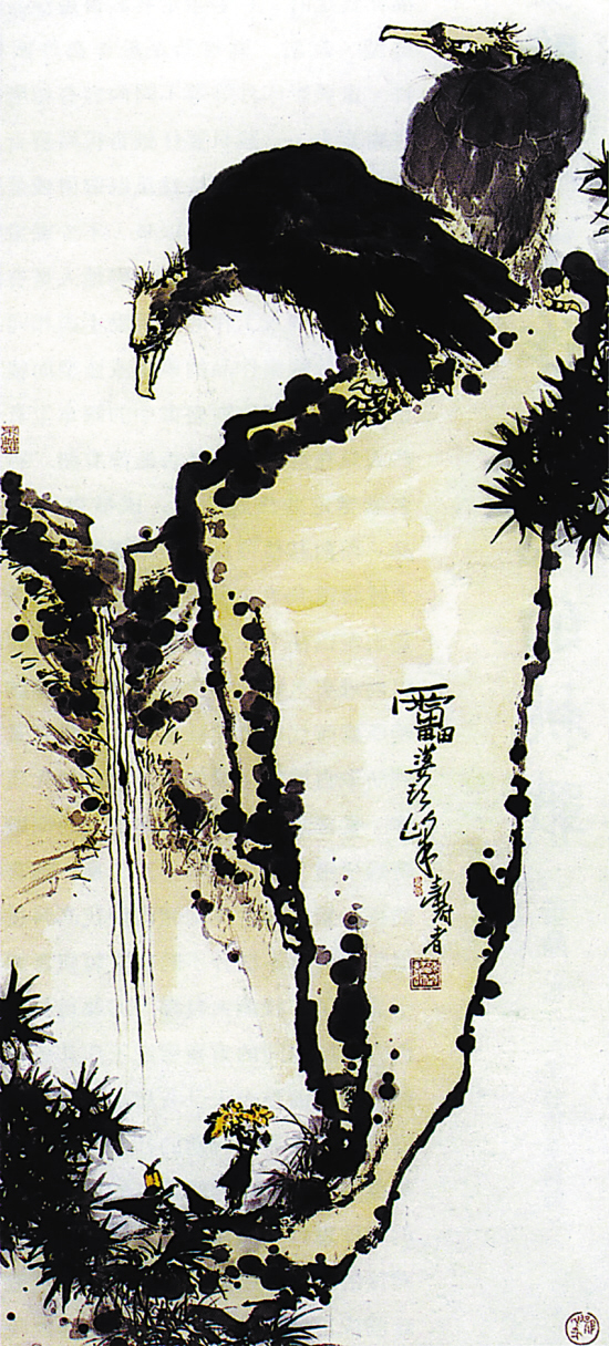 图1这件署名潘天寿的成品,是南方某拍卖行1999年春季拍卖会的拍品。以专业眼光近看此画的笔线,它皆呈似笔非笔、似指非指的视感,且造型也有明显的与潘老固有的不论是指墨画还是毛笔画艺术特点不相吻合之处(石块与鹫鸟的笔线尤甚)。原来此画根本就不是什么真迹,其母本图2系画家潘天寿多次出版过的指墨画佳作《老鹫图轴》,现由潘天寿纪念馆收藏。将它们两者作比较,前者笔墨与造型都很别扭,后者笔墨与造型则奇拙生动,在艺术上显然是泾渭分明。个中缘由是造假者在操作图1疑伪成品时,所用的工具和材质与原作者的不同,即把指墨画按毛笔画来操作了,而主观上却妄图要仿出与原作相近的艺术效果。试想,如此生硬甚至于还有一些可笑的炮制手法,成品哪能不变态呢?不过,该成品的制作也是有所变通,如原作母本的款识署着“雷婆头峰寿者指墨”到疑伪成品上就删去“指墨”二字,改为“雷婆头峰寿者”的名款,确也算是“合情合理”,说明该种作伪也有类似与“相对克隆”之处。