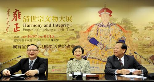 8月14日,台北故宫博物院与北京故宫博物院进行视频连线,共同宣布在10月份合办“雍正--清世宗文物大展”。据悉,本次展览预计展出总计246件雍正王朝的文物精品。此外,台北故宫博物院还从当日起在餐饮部、礼品部设捐款箱,接受游客捐款;大展举办期间,台北故宫博物院礼品部每天营业额的15%将拨出用于救助在台风中受灾的台湾民众。