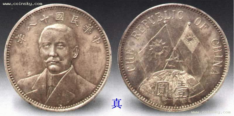 孙中山像地球版壹圆银币,民国十八年(1929)铸造。正面为孙中山着西装半身正面像,上有“中华民国十八年”七字;背为英文双旗地球图案,下“壹圆”两字。北伐战争胜利后,南京国民政府拟设计一套新的孙中山像银币,以取代旧有的袁世凯像银币。孙像地球版银币即是新设计的几种样币之一。该币图案精致,孙像面带微笑,显得比较年轻。因未正式发行,所以存世极少。此品曾在第一届钱币拍卖会上以 50万人民币成交过一枚。