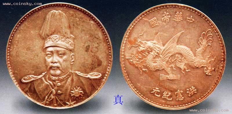 此为近年利用高科技制造的仿袁世凯正面像背飞龙银币。粗看文字图案和真品无异,只有用放大镜才能发现几处微小的差别来,如仿品袁像的右肩章外边缘处多了一小块半圆状的突起;袁像左耳的皱折过于生硬;眼睑部分也有同样迹象;帽沿处的线条略有弯曲,不够挺拔。真品外周的圆珠匀称标准,仿品的圆珠往往不呈正圆形。又仿品表面的光洁度不及真品,文字也略显软弱。