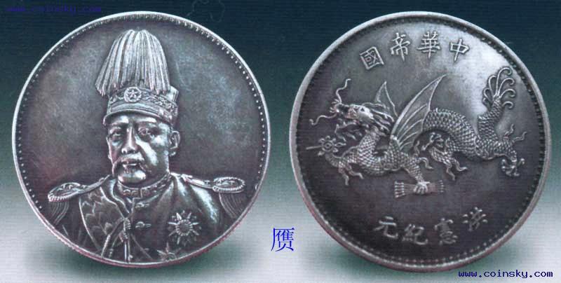 袁世凯正面像背飞龙银币,民国五年(1916)后天津造币厂铸造。币身无面值,但大小材质重量均和一元银币相同,所以有称为银币、也有称为银章的。一说是1916年袁世凯实行帝制时所铸,所以飞龙下方有洪宪纪元四字。一说是1919年前后天津造币厂摹仿洪宪元年飞龙小金币的图案制成一元型的飞龙银币,作馈赠有关方面之用。铸量多于一般的试铸币,今民间尚能见到。