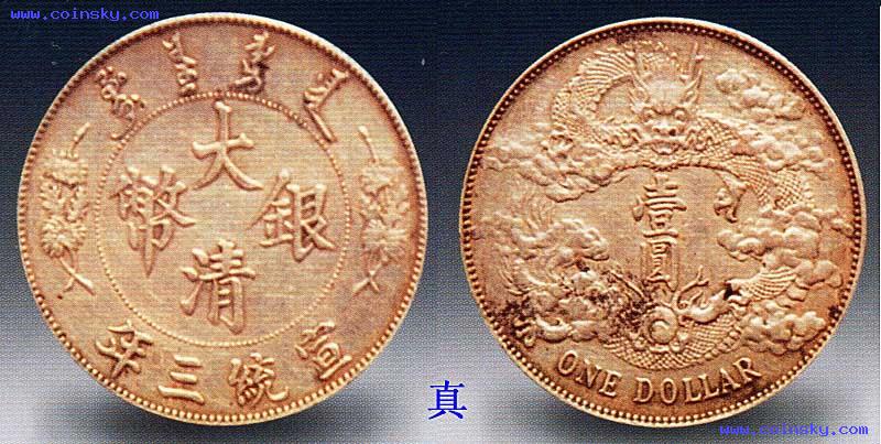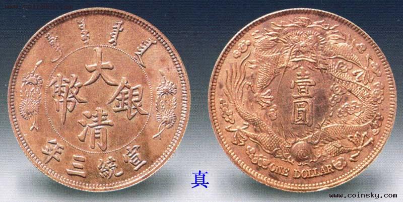 宣统三年大清银币仿品有机制和失蜡制造两大类。在两大类仿品中又有银质和非银质两种不同的材质,通常银质仿品的仿制对象大多为宣统三年的高档样币,普通的曲须龙一般均为非银质材料仿制。其中失蜡制造的仿品可用放大镜观察,凡底面不平,有微小麻点或齿点,龙鳞、文字笔画有粘连者即可断定为仿制品。本图所示的仿品为机制品,用放大镜观察较难识别。可用轻击听声音来辨别,仿品声音大多偏尖、偏长,呈锐音,真品声音适中,呈和音。若能用其他真品银元比照听声,即能明确地辨认出仿品。