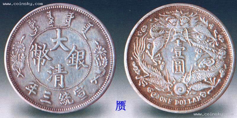 大清银币长须龙壹圆,清宣统三年(191 1)天津造币总厂铸。当时清政府欲统一币制,聘请海外高级技师精心设计制造了这套宣统三年大清银币,计有六、七种版式,长须龙是其中之一。新币刚试铸成功,正逢武昌起义,于是大部分新版银币胎死腹中,只留有少量样币。长须龙因背面龙首之须特长而得名,属于试样性质,因图案精致、存世稀少而受人重视。