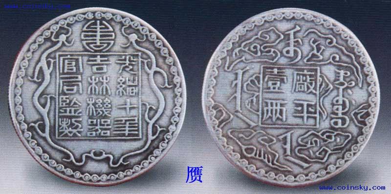 吉林厂平壹两银币,清光绪十年(1884)吉林省铸行。正面四周有双龙连珠纹及寿字,中间方框内有“光绪十年吉林机器官局监制”12个篆文,背有“厂平壹两”纪重。当时吉林地区制钱紧缺,当局赶制银钱救急,这种银币以土法打制,所以也称为银饼。除一两币外,尚有七钱、半两、三钱、一钱等几种面值,铸量不多,如一两银币仅铸198枚,最为珍稀。
