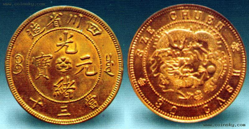四川省的铜元有“四川官局造”与“四川省造”两大类,前者为光绪二十九年至三十一年(1903—1905),由四川总督岑春煊奏准在成都开铸;后者为光绪三十年至三十一年(1904—1905)由四川银铜元总局制造。当三十铜元为后者,试制于光绪三十年(1904),有飞龙和水龙两种,厚0.24厘米。试铸后未批量投入生产,今存世极罕。