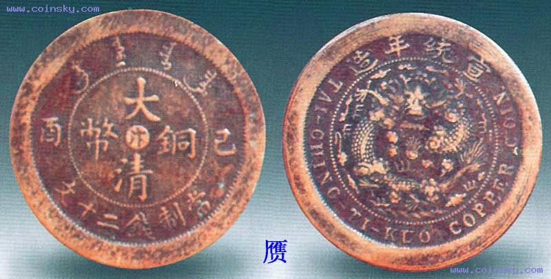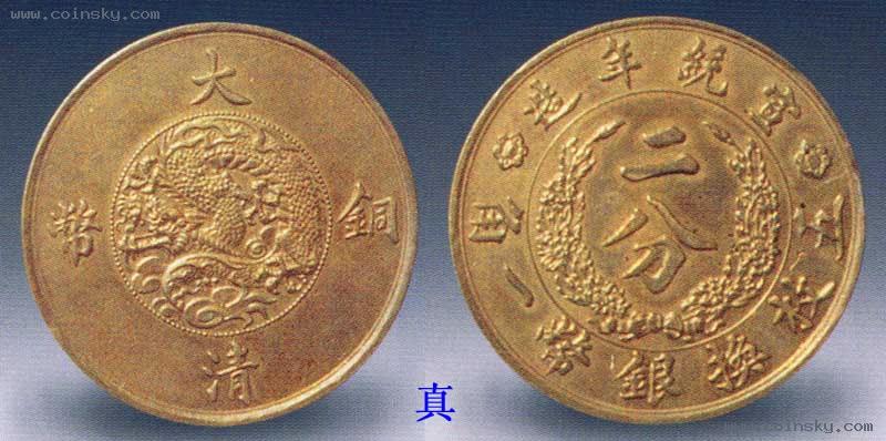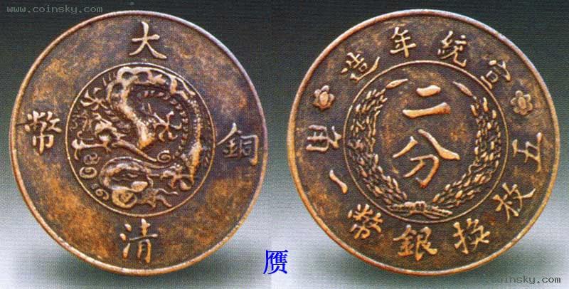 宣统年造大清铜币二分白铜元,1911年度支部造币总厂铸于灭津。白铜质地,设计新颖,图案精美,属试样性质。清宣统二年(1910)政府通过了币制则例,决定废两改元(参见前款)。新币铸成后适逢辛亥革命爆发,于是这套铜元未能正式发行。所见有紫铜、橙色铜及白铜三种质地,白铜者最为稀少,特别珍贵。