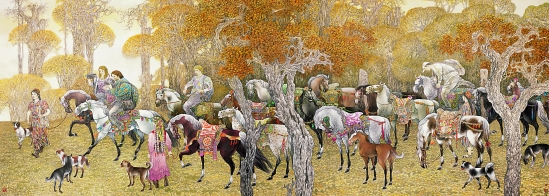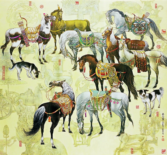 距今约一万年前,人类进入新石器时代,野马逐渐被驯化,矫健、英俊、忠诚、温驯的马,逐渐在狩猎、交通、征战、农耕等方面发挥越来越重要的作用,也为古代艺术家创造了一个广阔的艺术空间。岩画、壁画、雕塑、绘画,马逐渐成了艺术表现的主要载体,特别是秦兵马俑的威武严整,霍去病石雕的浑朴自然,汉画砖石和青铜雕刻的飞扬神采,唐三彩造型的精美,都为唐代的工笔鞍马画派的发展起到了巨大的推动和铺垫。由于唐朝政治开明清廉,经济繁荣昌盛,艺术自由热情,使唐朝的工笔鞍马画得到高度的发展和繁荣,并成了当时最为强盛的独立画科,涌现了一大批卓有成就的鞍马画大家。如韩干、曹霸、张宣、韦偃都为后人留下一大批宝贵的精品力作,并确立了东方绘画的风格和审美情趣,为东方的架上绘画打下了坚实的基础。宋代继承了唐代的绘画风格,再加上帝王的推崇和爱好,鞍马画派不但得到继承而且发展壮大,并冒出不少名家高手。北宋的李公麟,南宋的陈居中,金国的张瑀都为工笔鞍马画的发展作出了重要的贡献。元代师古之风甚兴,时代气息淡薄,但在官场上还是出现了赵孟頫和任仁发这样的鞍马画大家,马的造型色彩的渲染都达到相当的高度。元之后每况愈下,600多年难寻几幅工笔鞍马精品力作,更难找到几位工笔鞍马画派大家。清宫之中倒是出了几位洋人画家,也画了不少工笔鞍马作品,透视、素描、结构和色彩都是挺讲究,但毕竟是洋人唱京剧——洋味太重。更让人难堪的是宫廷绘画竟只能由几位洋人堂而占之,中国绘画的门面得由洋人来支撑,败落到这种地步确实让炎黄子孙感到颜面无光。现代画家徐悲鸿利用水墨借鉴西画创作了大量写意鞍马作品,开创了新的马画空间,得到了广大观众的喜爱和赞赏,也被成千上万的画家和爱好者所追随摹仿。但遗憾的是1000多年前就开创的工笔鞍马画并未得到继承和发展,元朝之后的衰败之势并未得到改观,600多年空白荒野始终未得到开拓和发展。新中国成立,特别是改革开放之后,中华大地政通民和经济繁荣,百花齐放百家争鸣,文化空前发展。盛世年华必定再现大唐工笔鞍马画派的繁荣和发展,这是历史的必然,时代的需要。