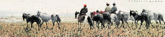 从油画到连环画,从速写到水彩画,从工笔重彩到水墨写意,从地方研究生到军旅画家,从主题性创作到艺术的个性追求,他涉猎的画种非常宽广,他生活的阅历非常丰厚,他创作的题材非常广博,他发掘的审美内涵也非常深入。鉴于他取得的多方艺术成就,1997年后,他被任命为中国美术家协会分党组书记,当选为中国美术家协会第五届、第六届主席团常务副主席,当选为中国文联副主席、中国美术家协会主席、联合国教科文组织下属国际造型艺术家协会主席等职。作为中国美术界的重要领导,他的开拓精神和务实作风使中国美协在世纪之交的社会变革与转型中发挥了巨大的作用,他的宽广胸襟和真诚厚道赢得了广大美术家对他的信赖与赞誉。当然,站在中国美术界那样一个制高点上,他的胸襟、眼界与视野也更加开阔,俯瞰全局,把握方向,他更具有一种艺术的社会担当意识和时代的使命感。在他《晚风》、《小米加步枪》、《人民公仆刘少奇》、《朱德与史沫特莱》和《不畏蜀道难》等作品中,我们可以阅读到他怎样通过自己的画笔来表达他对于现实主题与历史主题的思考。这些作品不仅充分体现了他自己的艺术追求与个性风采,而且也塑造了当代审美中的中华民族的英雄形象。